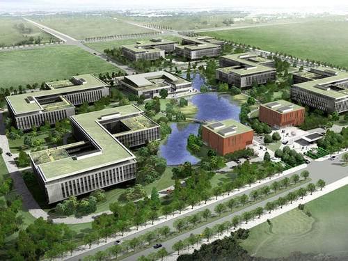 一座大湖兩側(cè)共有六座建筑物,內(nèi)設(shè)辦公室和實(shí)驗(yàn)室,形成研究園的連接部分。另外增加了兩座為管理人員、會(huì)議和主要餐飲設(shè)施準(zhǔn)備的小建筑。場(chǎng)地周圍的道路不允許車輛通行,內(nèi)部只允許行人進(jìn)入。西入口兩側(cè)是兩座小型入口建筑,通 過軸線連接研發(fā)園中央的餐飲設(shè)施。